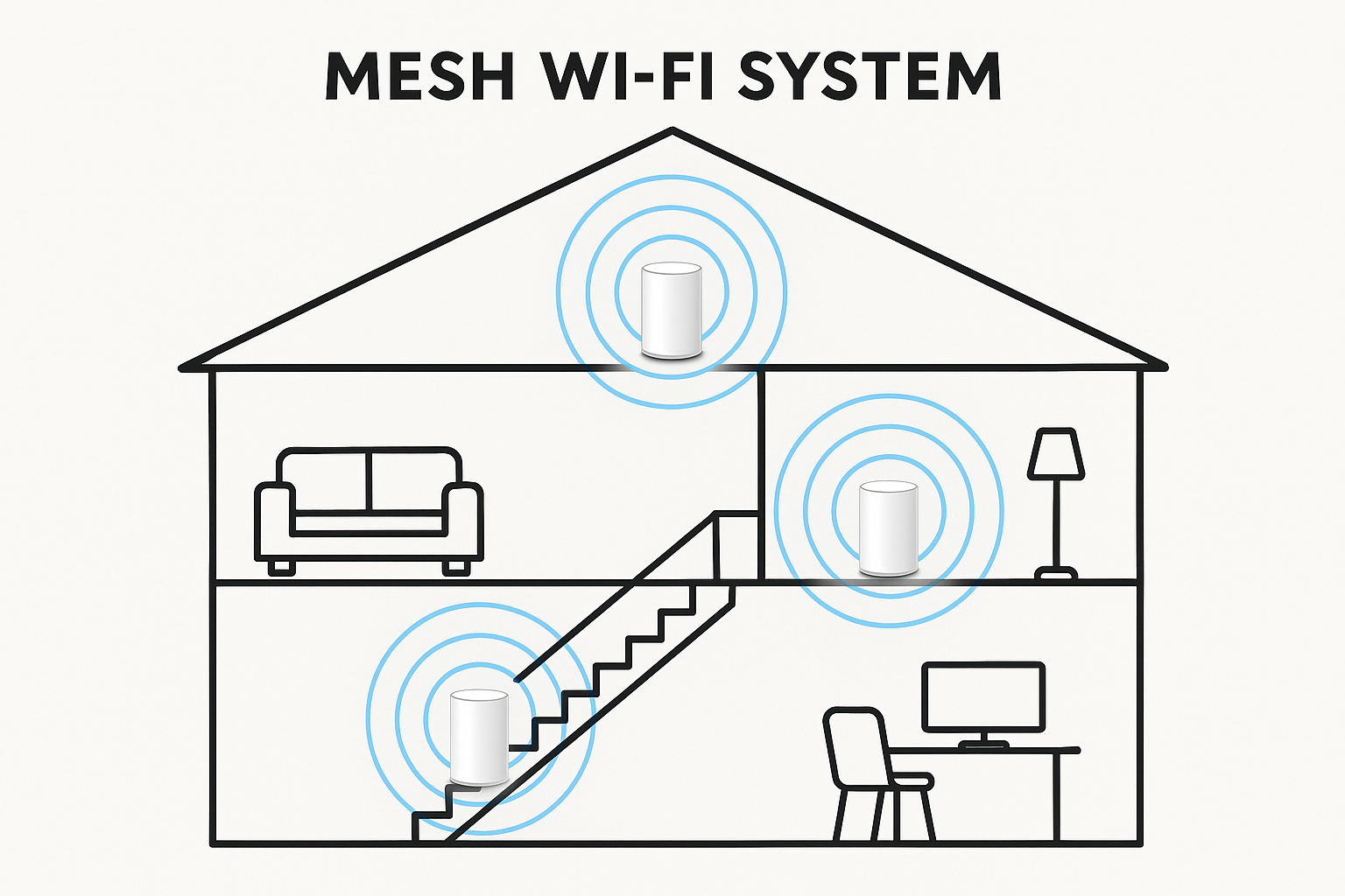 Imagine your home Wi-Fi as a single loudspeaker in a big concert hall. If you’re close to it, the music sounds great. But as you move farther away, the sound fades. A traditional router works the same way: it sends out a signal from one spot, and the farther you are, the weaker it gets.